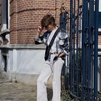The fifth look captures the "New Americana" wave of 2026, blending rugged workwear elements with sleek, urban accessories. The hero of this outfit is the blue checked flannel overshirt, which provides a tactile, patterned layer that feels approachable yet intentionally styled. By pairing it with a simple white t-shirt and white denim flare pants, the look achieves a high-contrast, clean aesthetic that feels incredibly fresh for the spring season. The camel western belt introduces a touch of vintage craftsmanship at the waist, while the black shiny loafers pivot the outfit away from pure casual-wear into something more sophisticated and intentional. To complete the ensemble, a black messenger bag from Arte adds a contemporary, streetwear-approved edge, offering a functional finish that aligns perfectly with the brand’s minimalist, design-forward reputation.