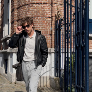 The bonus look, titled "Right on Track," is a definitive nod to the "Luxury Leisure" movement of 2026, where the boundaries between athletic wear and high-end tailoring completely dissolve. The foundation of the outfit is a pair of gray tracksuit pants, providing a relaxed, fluid base that is unexpectedly elevated by an off-white short-sleeve polo. This juxtaposition of sporty cotton and preppy pique is sharpened by the ultimate statement piece: a black leather hoodie jacket. The leather adds a structured, rebellious weight to the soft silhouette of the sweats, creating a look that feels tough yet incredibly comfortable. To lean into the lived-in, "street-verified" aesthetic, a washed-out black leather messenger bag adds a layer of vintage texture. The ensemble is capped off with black leather loafers, a bold footwear choice that replaces the expected sneaker to firmly plant this outfit in the realm of sophisticated, avant-garde streetwear.